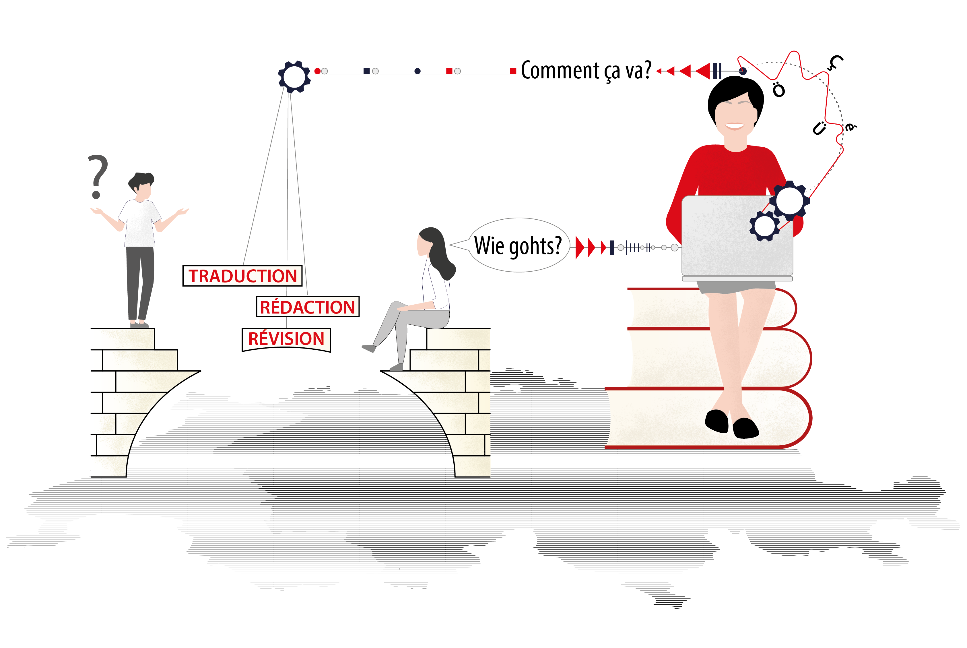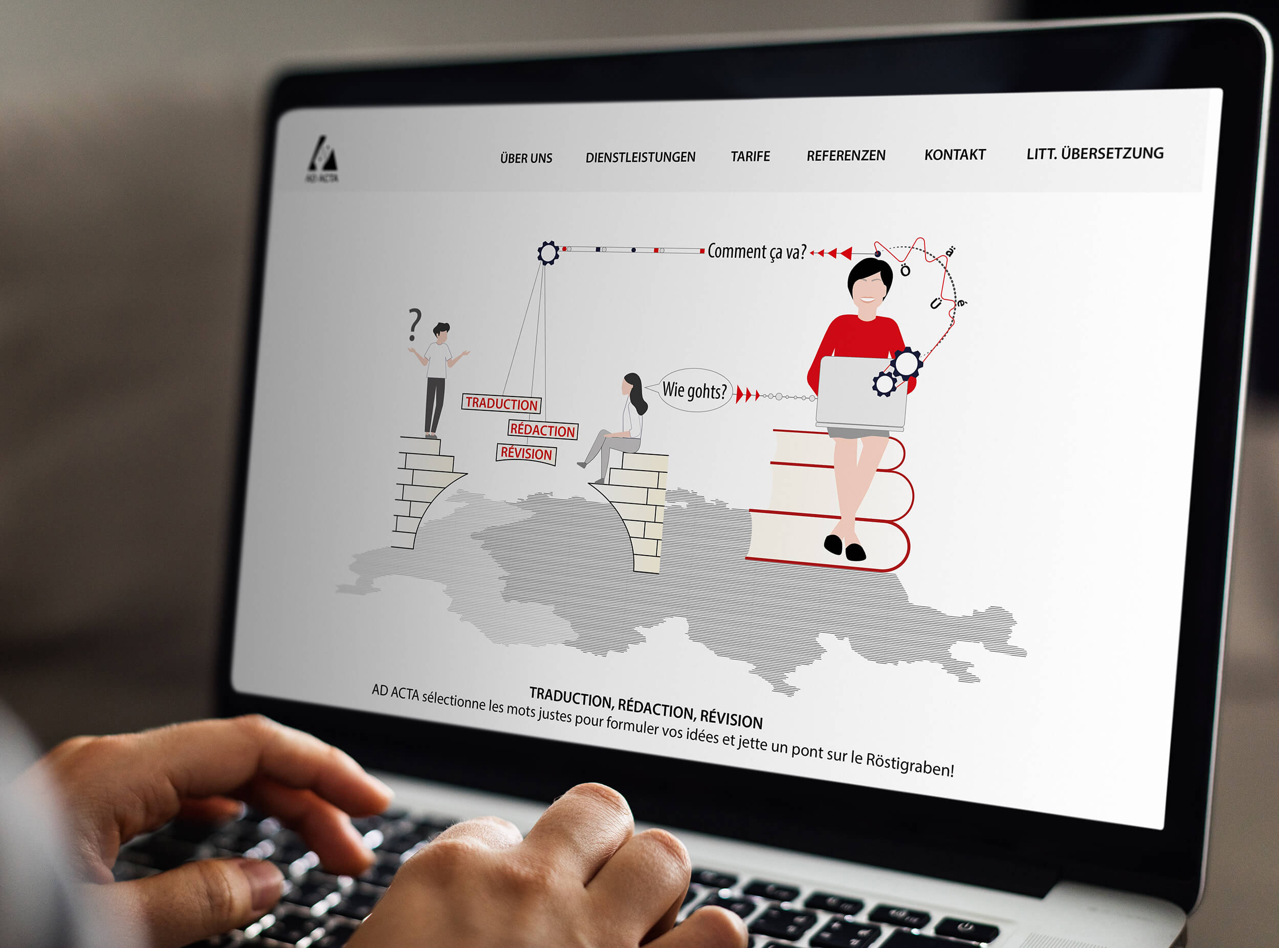 I created a stylized, geometric letter “A” composed of mirrored shapes, suggesting both pens and two voices in dialogue. The logo visually balances the two linguistic sides and symbolizes the bridging role of the translator. For AD ACTA’s website and social media, I developed a minimalist, map-based illustration showing two human figures reaching toward one another across a symbolic Swiss landscape, bringing the abstract concept of cultural divide into an accessible visual metaphor. A neutral monochrome palette with small red accents conveys seriousness and clarity, while keeping visual focus on the theme of human connection. Paired with modern, legible type and structured spacing for multilingual content adaptability.